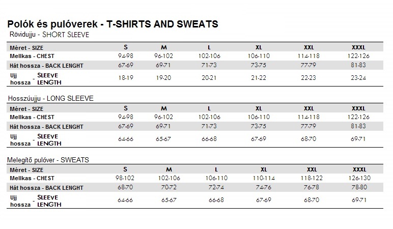 Póló méretek